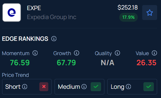 With a Momentum in the 76th percentile, Benzinga’s Edge Stock Rankings indicate that EXPE is experiencing short-term consolidation along with medium and long-term upward movement. Know how its momentum lines up with other well-known names.